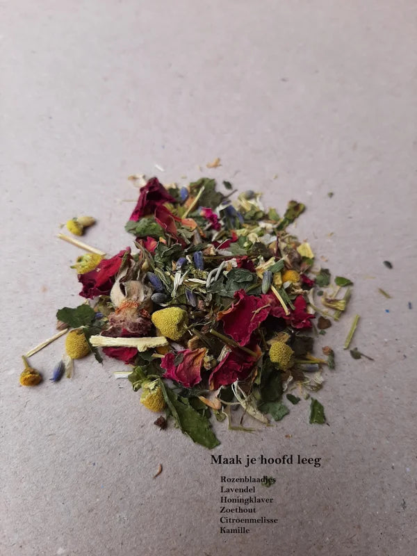 Elk zakje bevat 50 gram van deze kalmerende blend, perfect voor een moment van rust en reflectie. Geniet van een kopje "Maak Je Hoofd Leeg Thee" en laat je gedachten afdwalen naar een staat van pure ontspanning.